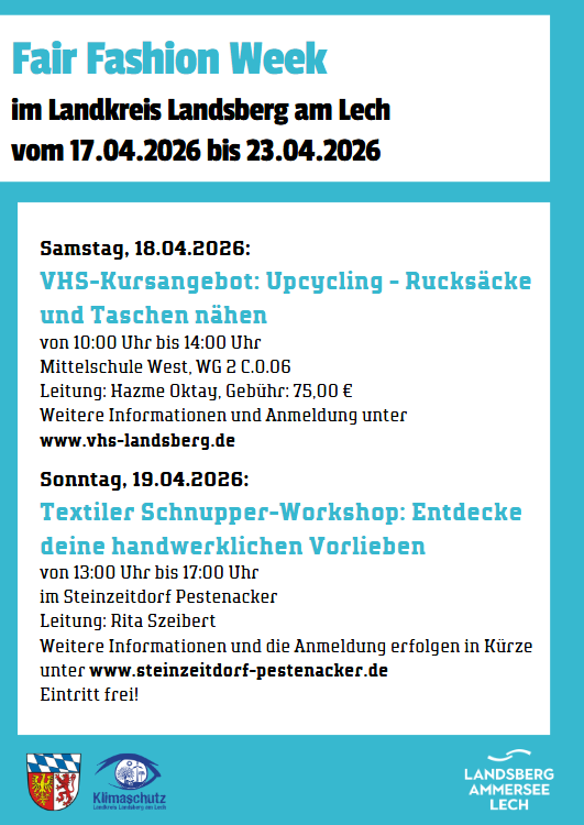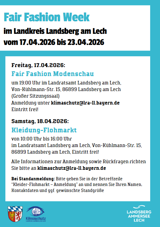 Im Landkreis Landsberg am Lech steht im April 2026 das Thema nachhaltige Mode im Mittelpunkt: Schülerinnen und Schüler, junge Kreative, Modeinteressierte und alle Bürgerinnen und Bürger sind eingeladen, sich mit dem Thema Nachhaltigkeit in der Textil-Branche zu befassen und mit dem eigenen Konsumverhalten zu beschäftigen. Mit einem Wettbewerb, Vorträgen, Modenschau, verschiedenen Workshops, Filmvorführungen, einem Kleiderflohmarkt und Ausstellungen möchte der Landkreis Landsberg am Lech ein starkes Signal für nachhaltige Mode setzen.
