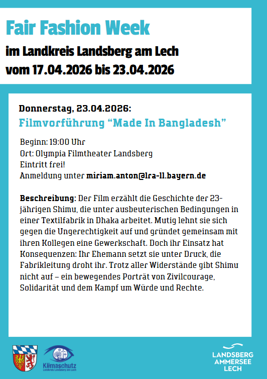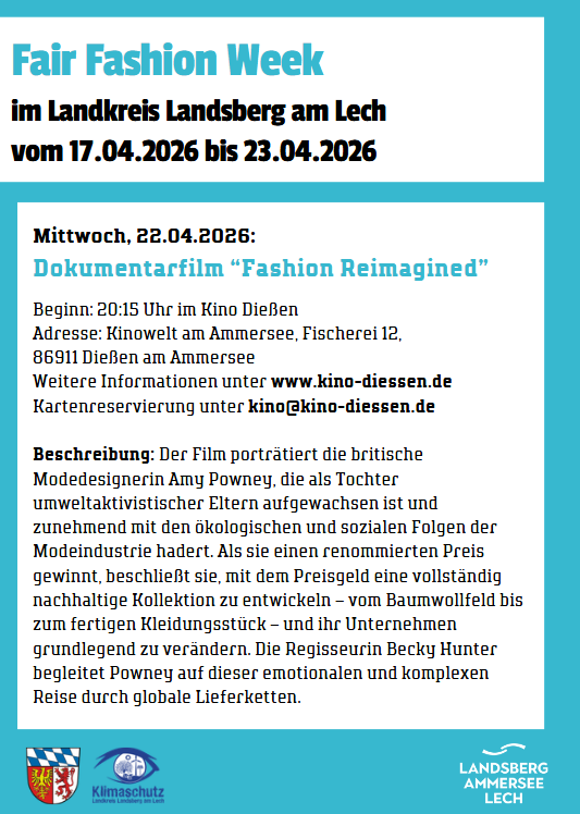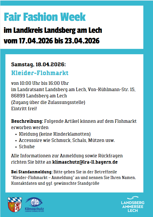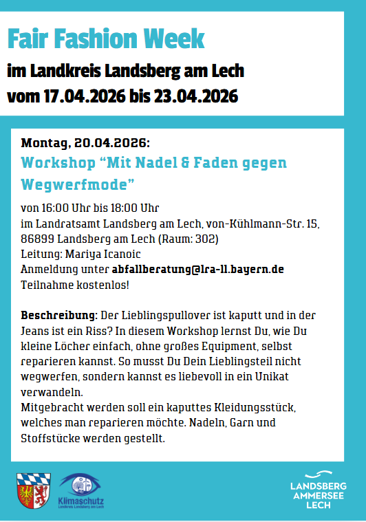 Die Präsentation der besten Outfits findet am 17. April 2026 im Landratsamt Landsberg am Lech mit einer großen Fair Fashion Modenschau statt. Hier hast du die Möglichkeit dein nachhaltiges und kreatives Outfit entweder selbst oer von einem Model präsentieren zu lassen!